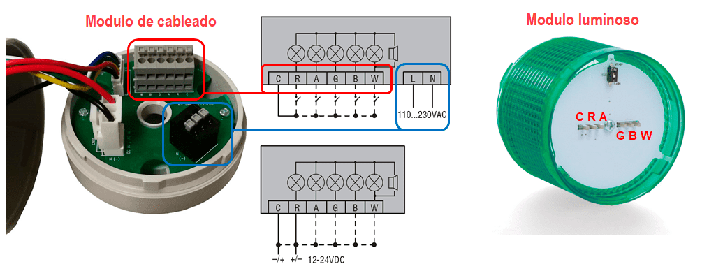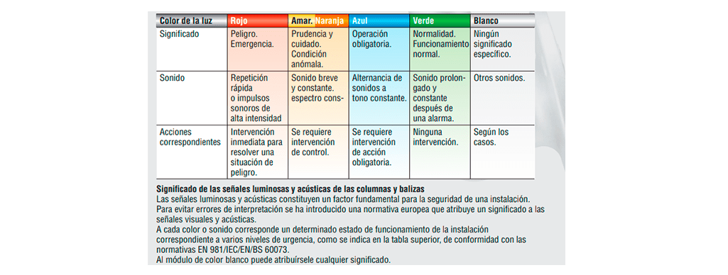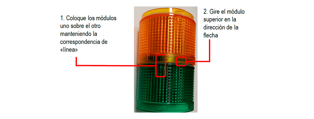 Con el objetivo de optimizar el mantenimiento de existencias, cada torre de iluminación cuenta con un módulo LED de 24 V CC integrado, independientemente de la tensión de alimentación del módulo de cableado. Los módulos de luz pueden emitir luz intermitente o fija, y están disponibles en colores verde, amarillo, naranja, rojo, azul y blanco.