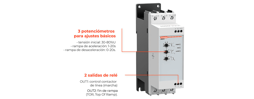 El ADXNB es la solución ideal para aquellos que buscan un arrancador con funciones básicas y fácil configuración para el control del arranque y la parada gradual del motor. Con solo 3 parámetros ajustables a través de los potenciómetros frontales, la configuración se simplifica al máximo. Estos parámetros incluyen la tensión inicial, la rampa de aceleración y la rampa de desaceleración. Con una configuración sencilla y eficiente, el ADXNB es la opción perfecta para aplicaciones que requieren un control de motor preciso y confiable.
