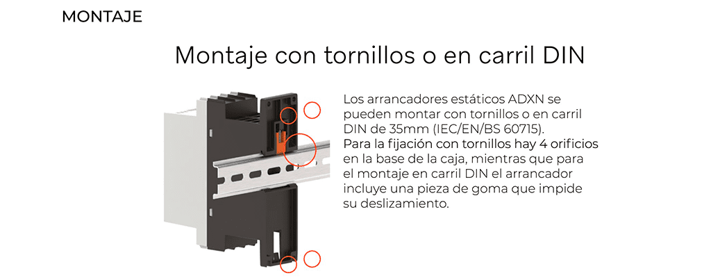 Los arrancadores estáticos ADXN de hasta 30A tienen la opción de equiparse con un ventilador adicional (código EXP8007). Esta opción es de serie en las versiones de 38 y 45A. El ventilador opcional proporciona una mejor disipación del calor, lo que aumenta significativamente el número de arranques por hora.