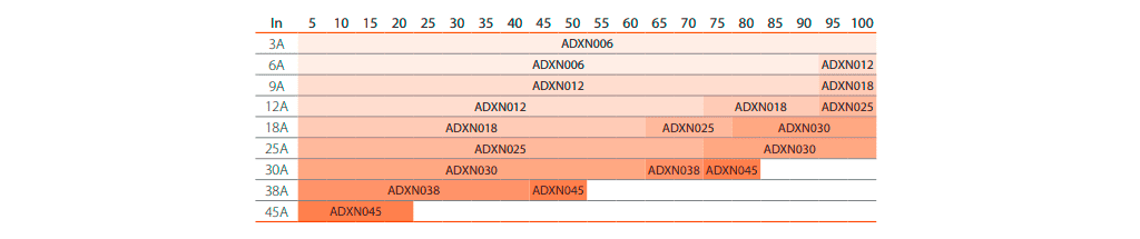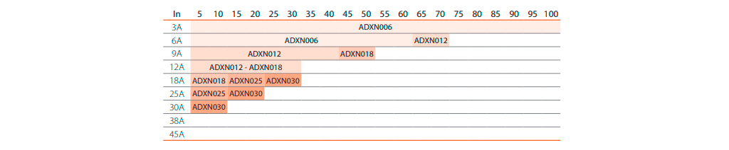 Los arrancadores estáticos ADXN ofrecen óptimas prestaciones para el control de la mayoría de las aplicaciones y son capaces de realizar un alto número de arranques por hora, incluso se puede aumentar esta capacidad al agregar el ventilador opcional (incorporado de serie en las versiones 38 y 45A) para satisfacer las necesidades específicas de cada aplicación. Los datos se refieren a las siguientes condiciones de prueba: temperatura ambiente +40°C, corriente de arranque 4*In (In = corriente nominal del motor) y tiempos de rampa de 6 segundos.