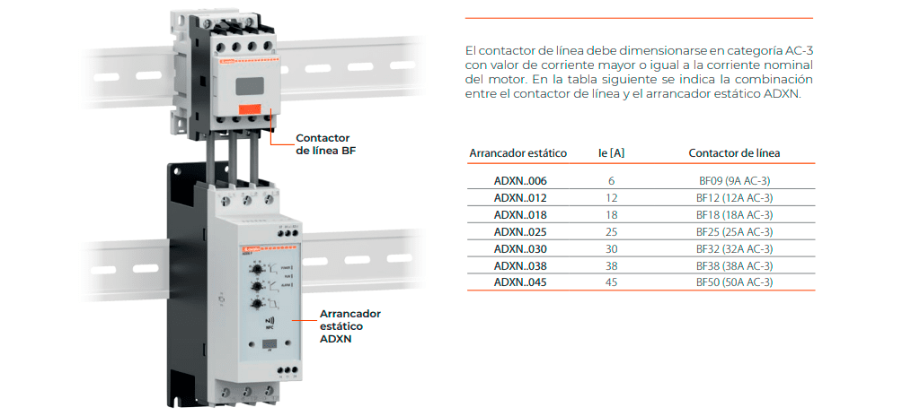 Los arrancadores estáticos serie ADXN ofrecen una solución ideal para aquellos que buscan un producto sencillo, compacto y fácil de configurar para el control gradual del arranque y parada de motores. Su versatilidad los hace adecuados para diversas aplicaciones, como el control de bombas, ventiladores, cintas transportadoras y compresores, y están disponibles en corrientes nominales que van desde 6 hasta 45A.