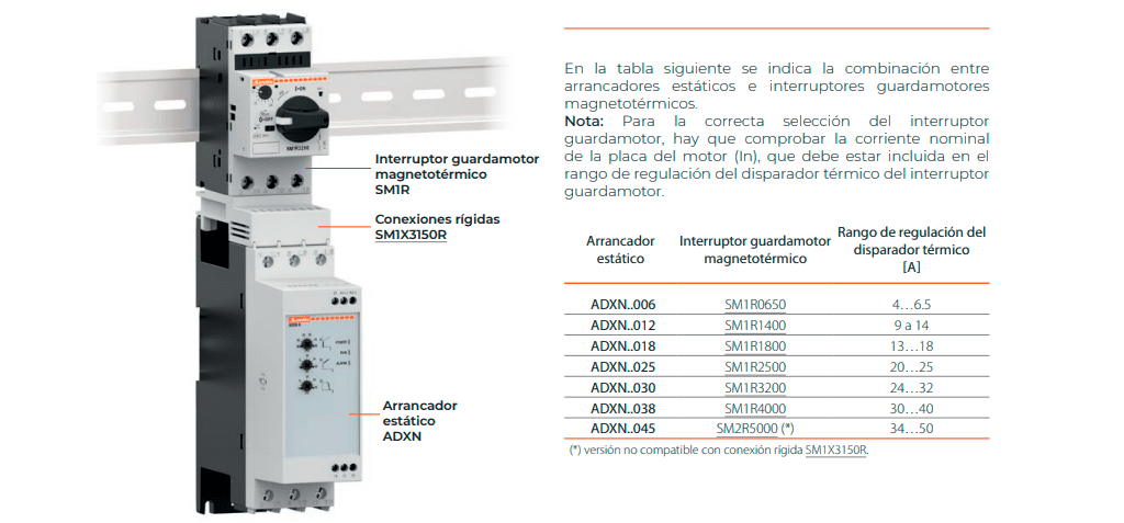 Es posible instalar un interruptor guardamotor magnetotérmico aguas arriba de los arrancadores estáticos ADXN para proteger contra cortocircuitos y sobrecargas. Además, para simplificar el cableado y reducir el tiempo de montaje, está disponible la opción de conexión rígida SM1X3150R, que permite montar directamente el arrancador estático ADXN (hasta la versión de 38 A) con un interruptor guardamotor magnetotérmico tipo SM1R con mando rotativo. De esta manera, se pueden realizar arrancadores compactos de manera más sencilla.