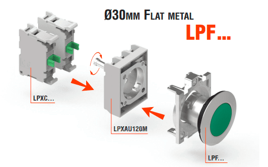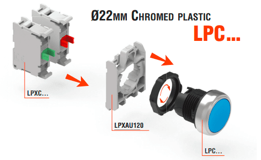 Los actuadores de la versión LPC están fabricados en poliamida, con una brida exterior de plástico cromado. Una de sus ventajas más destacadas es la rapidez de instalación: los actuadores pueden fijarse previamente al panel mediante una junta específica, para luego cerrar la brida roscada. La base de fijación y los contactos se montan a presión. La gama de actuadores es muy completa y permite múltiples soluciones, incluso personalizables, para distintas aplicaciones.