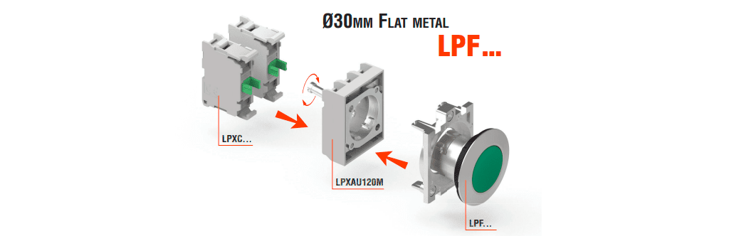 También la brida exterior de los actuadores presenta un perfil rebajado para garantizar poca profundidad junto con el actuador y reducir así el espacio necesario. La profundidad total desde el frente del panel hasta el fondo del primer elemento de contacto es de tan solo 43 mm (versión metálica y plástica de Ø22mm) y de 49 mm (versión metálica enrasada de Ø30mm).