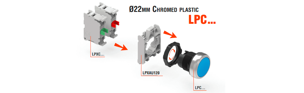 La línea plástica cromada de Ø22mm incluye también una serie de actuadores monobloque que comprende pilotos de LED, potenciómetros y zumbadores.