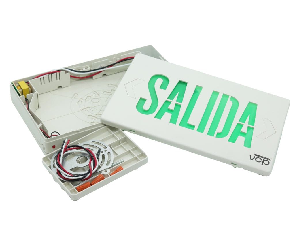 Aviso de salida de emergencia en ESPAÑOL, letras color VERDE.